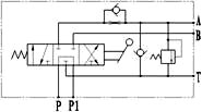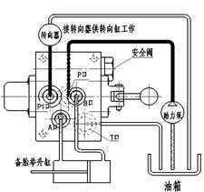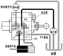 35SZH型組合閥用於備胎架液壓係統的升降控製時,P口與轉向助力泵出油口連接,P1口與轉向器進油口連接,A口接備胎架油缸小腔,B口接備胎架油缸大腔,T口接轉向係統油箱。通過操縱該閥手柄杆,控製油缸伸出或退回,實現對備胎架升降的控製。該閥的工作原理示意圖如下: