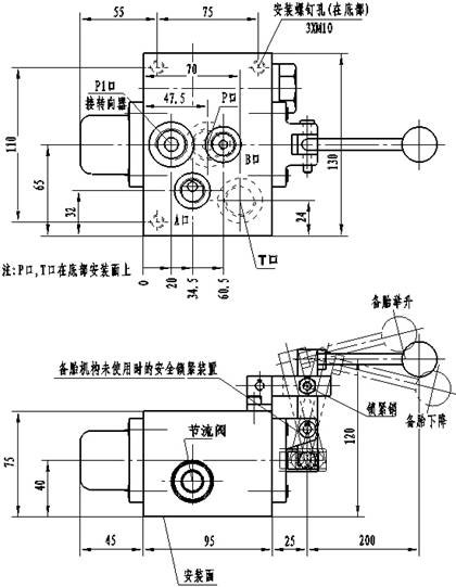該閥在中位時,P口到P1口接轉向器供汽車行駛轉向用。這時將換向閥操縱杆加以鎖緊裝置防止滑閥竄動,保證汽車安全行駛。當操作換向閥手柄在位置Ⅰ時P口到B口接油缸大腔,此時備胎機構下降,油缸小腔由A口到P1口利用轉向器中位的H型機能排油流回油箱。當操作換向閥在位置Ⅱ時P口到A口接油缸小腔,此時備胎機構舉升,油缸大腔由B口到T口排油流回油箱。