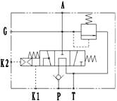 工作原理及圖形符號: 操縱氣閥使壓縮空氣進入HLQ-L20H型氣動控製閥氣缸體K1口時,壓縮空氣通過氣缸活塞推動閥芯移動,進油口P與工作油口A接通,壓力油從P口經過A口進入舉升缸,使車廂開始舉升;操縱氣閥切斷壓縮空氣進入HLQ-L20H型氣動控製閥氣缸體時,該閥閥芯在彈簧力作用下回到中位,壓力油從P口經過T口回油箱,停止向舉升缸供油,車廂中停;操縱氣閥使壓縮空氣進入HLQ-L20型氣動控製閥氣缸體K2口時,壓縮空氣通過氣缸活塞拉動閥芯移動,壓力油從P口經過T口回油箱的同時,舉升缸的液壓油也從A口經過T口回油箱,車廂在自重的作用下開始下降。
