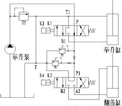 在舉升過程中,舉升泵輸入的液壓油全流量進入舉升缸;在頂蓋開啟、關閉過程中,舉升泵輸入的液壓油經過分流閥後,分流出一部分(30L/min)進入頂蓋油缸,其餘的液壓油流回油箱。