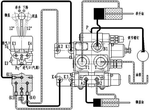 舉升泵供油進入QDF-L20型氣控多路閥後,通過操作氣控操作閥不同位置,讓壓縮空氣分別進入該閥所帶氣缸,當推動舉升閥閥芯時,可實現車箱舉升、中停、下降等功能;當推動換向閥閥芯時,可實現車箱頂蓋開啟、閉合等功能。