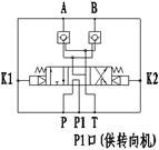 QDZ9114型氣控閥組在中位時,P口與P1口相通,壓力油由P口進入,經過P1口可向其它機構提供油源。當壓縮空氣進入K1口或K2口時,該閥處於換向位置,壓力油由P口經過A口(或B口)進入油缸的一腔,油缸另一腔的油液由B口(或A口)經過T口回油箱,控製油缸的伸縮;當切斷進入該閥的壓縮空氣時,閥芯在彈簧力的作用下回到中位,雙向液控單向閥(液壓鎖)關閉,鎖定油缸的伸縮。該閥的工作原理示意圖如下: