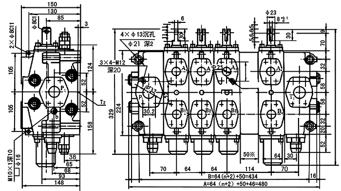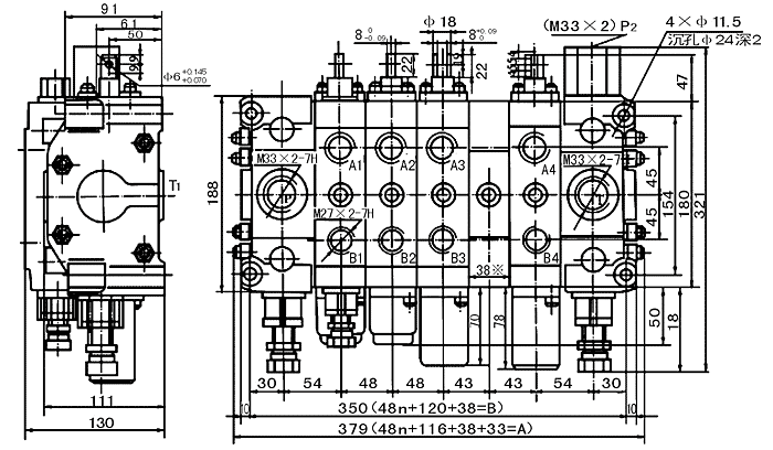 注:1.當有過橋閥體時,回油口在T1位置,引出壓力油口在T口位置。