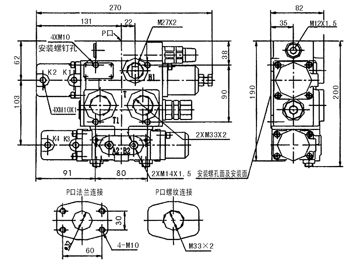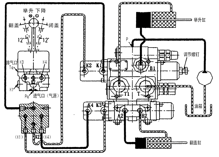 4KQF型操縱氣閥與QDF-L20F-A型氣控多路閥應用連接圖: