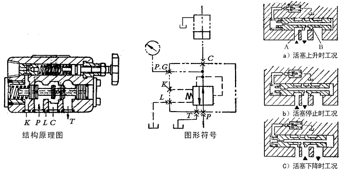 RBG-03先導式平衡閥的主閥為滑閥式結構。圖a)為缸上升的情況,當C口的壓力未達到設定的壓力時,滑閥在彈簧力的作用下處於圖示位置,閥口A開啟,壓力油由P口至C口,活塞上升。圖b)為活塞停止時的情況,當C口壓力達到設定壓力後,導閥開啟,滑閥上的節流孔使滑閥兩端產生壓差,滑閥左移減壓,直至閥口A關閉;若泄漏使C口壓力下降,則滑閥右移,P口向C口供油,從而使C口壓力恒定,達到平衡目的.圖c)為活塞下降的情況,當缸加上外負載,C口的壓力大於設定壓力時,滑閥兩端的壓差增大,滑閥左移到圖示位置,閥口B打開,油液由C口流向T口。從遙控口K接遠程調壓閥,可對C口的設定壓力進行遠控。