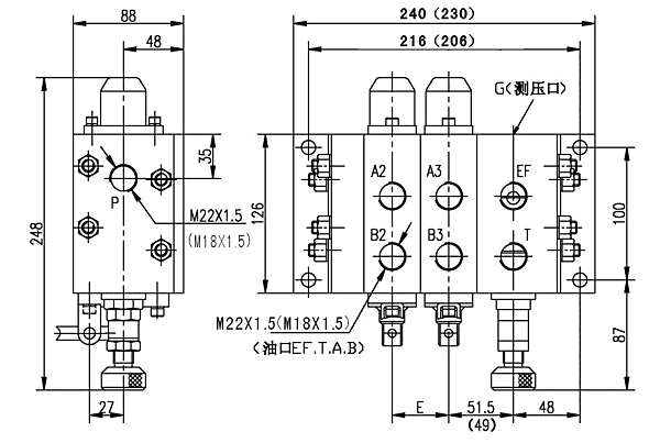 ZS3-L※※-OW・OT/FLD型多路換向閥(10通徑E=40;15通徑E=45;N為換向閥片數)括號內為10通徑尺寸