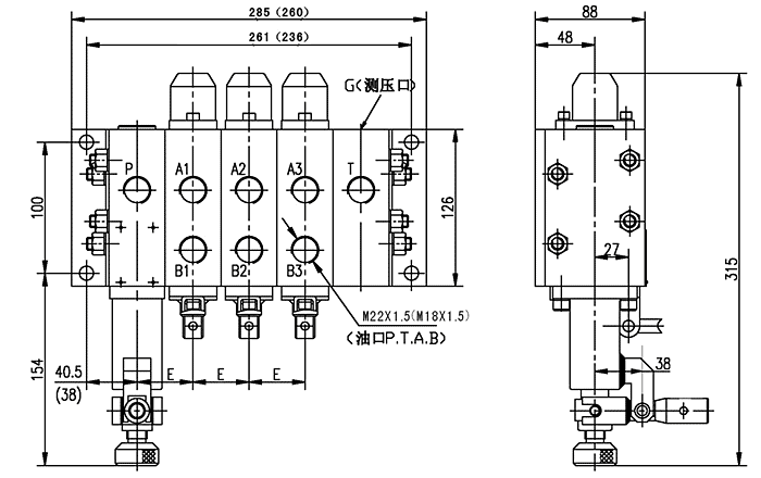 ZS3-L※※-OT・OT・OW型多路換向閥(10通徑E=40;15通徑E=45;N為換向閥片數)括號內為10通徑尺寸