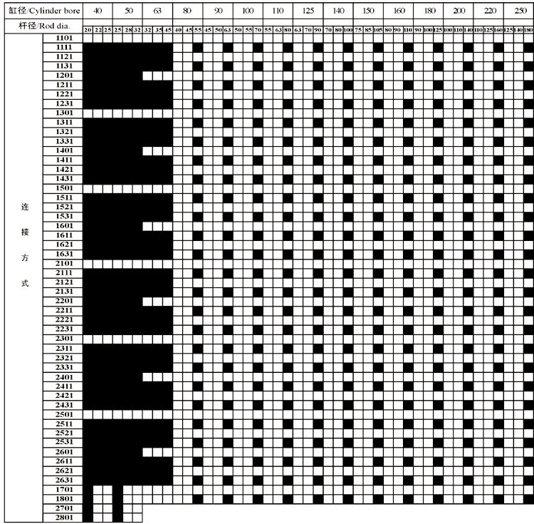 用戶選型完後,請將選用的主參數(缸徑、活塞杆徑)及連接方式編號與下表進行核對,以免選型差錯。