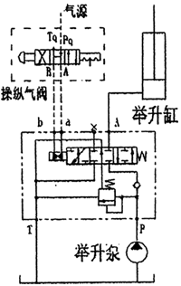 KQF34型操縱氣閥的中間位置PQ是封閉的,A口和B口與Tq口連通。拉出或推入操縱氣閥的手柄可改變A口或B口的氣流狀態,控製舉升閥主閥芯的移動,使雙作用液壓缸實現上升―中停―下降(下降―中停―上升)運動。當操縱氣閥處於中間位置時舉升閥氣缸內壓縮空氣由該閥排入大氣,舉升閥主閥芯回到中位,使液壓係統卸荷。