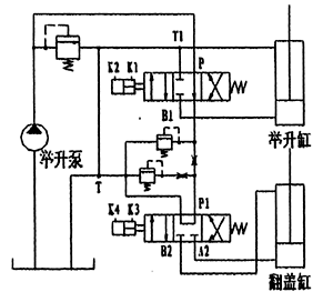 當氣控多路閥處於中間位置時,使車廂舉升位置保持不變,同時係統壓力油供另一組帶附加功能(翻蓋功能)的閥片工作即可實現車廂翻蓋的閉合―展開功能。該閥的工作原理示意圖如下