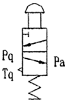 在氣控限位閥的限位杆行程範圍內(即Pa口的閉合―開啟―閉合)實現車廂下降―舉升―下降往複變化過程,使車廂產生輕微抖動有利於將車廂內的殘留物體卸掉。在連接示意圖(2)中搬動操縱氣閥的手柄換向至工作位置(Pq口與A口連通)將壓縮空氣經氣控限位閥進入舉升閥的氣缸K1口實現液壓缸上升。當車廂舉升到最大轉角位置時,限位機構將氣控限位閥的限位杆壓下切斷其進氣口(Pq口與Pa口是斷開),Pa口與Tq口接通使舉升閥氣缸內的壓縮空氣由氣控限位閥排入大氣。這時舉升閥回到中位,P口經A口與T口連通回油,B口關閉車廂處於最高舉升位置狀態,該閥的工作原理示意圖如下。